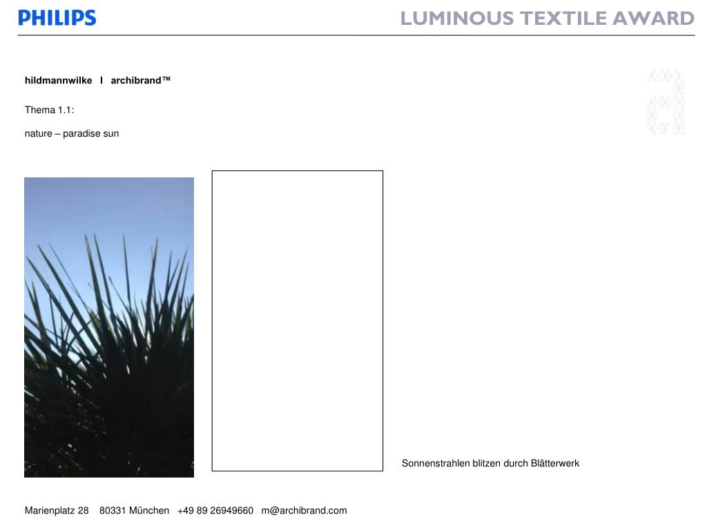LUMINOUS TEXTILE AWARD hildmannwilke I archibrand™ Thema 1.1: nature – paradise sun Sonnenstrahlen blitzen durch Blätterwerk Marienplatz 28 80331 München +49 89 26949660 m@archibrand.com