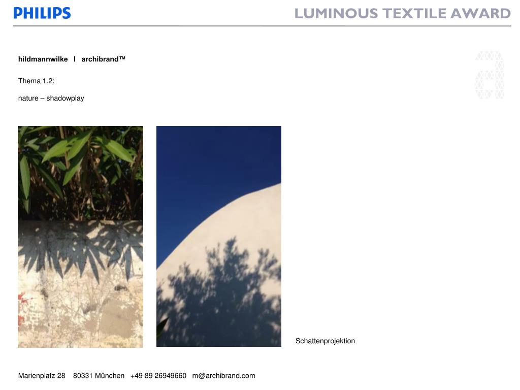 LUMINOUS TEXTILE AWARD hildmannwilke I archibrand™ Thema 1.2: nature – shadowplay Schattenprojektion Marienplatz 28 80331 München +49 89 26949660 m@archibrand.com