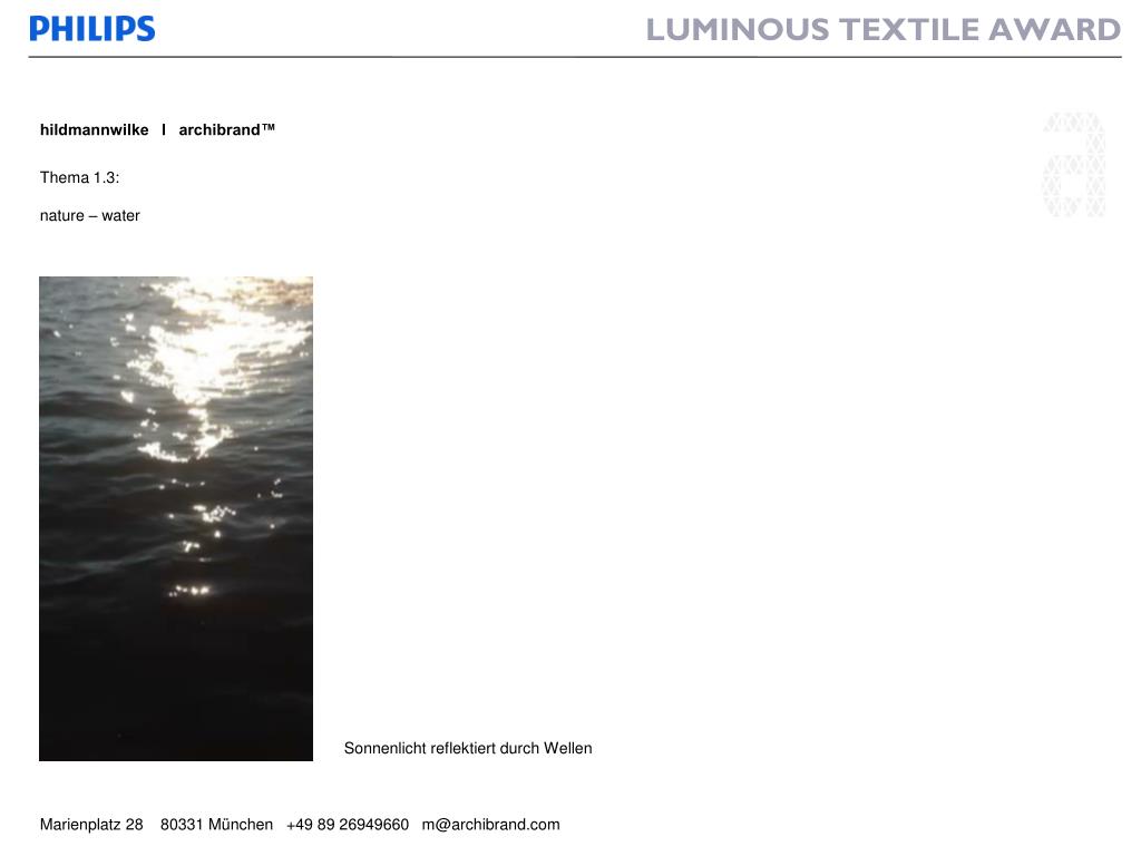 LUMINOUS TEXTILE AWARD hildmannwilke I archibrand™ Thema 1.3: nature – water Sonnenlicht reflektiert durch Wellen Marienplatz 28 80331 München +49 89 26949660 m@archibrand.com