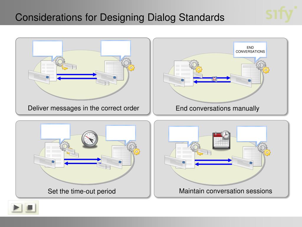 Considerations for Designing Dialog Standards END CONVERSATIONS End conversations manually Maintain conversation sessions Set the time-out period Deliver messages in the correct order