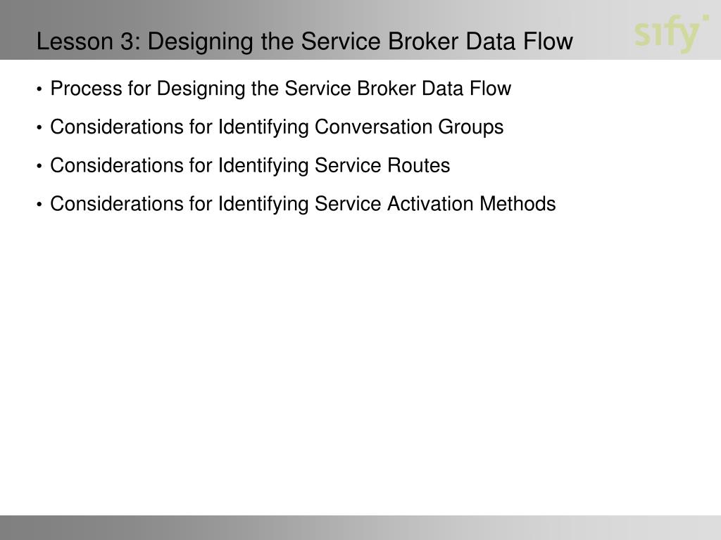 Process for Designing the Service Broker Data Flow Considerations for Identifying Conversation Groups Considerations for Identifying Service Routes Considerations for Identifying Service Activation Methods Lesson 3: Designing the Service Broker Data Flow