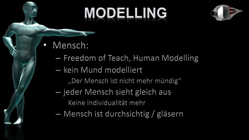 Modelling • Mensch: • Freedom ofTeach, Human Modelling • kein Mund modelliert „Der Mensch ist nicht mehr mündig“ • jeder Mensch sieht gleich aus Keine Individualität mehr • Mensch ist durchsichtig / gläsern