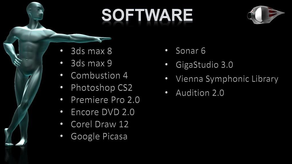 Software • Sonar 6 • GigaStudio 3.0 • Vienna Symphonic Library • Audition 2.0 3ds max 8 3ds max 9 Combustion 4 Photoshop CS2 Premiere Pro 2.0 Encore DVD 2.0 Corel Draw 12 Google Picasa