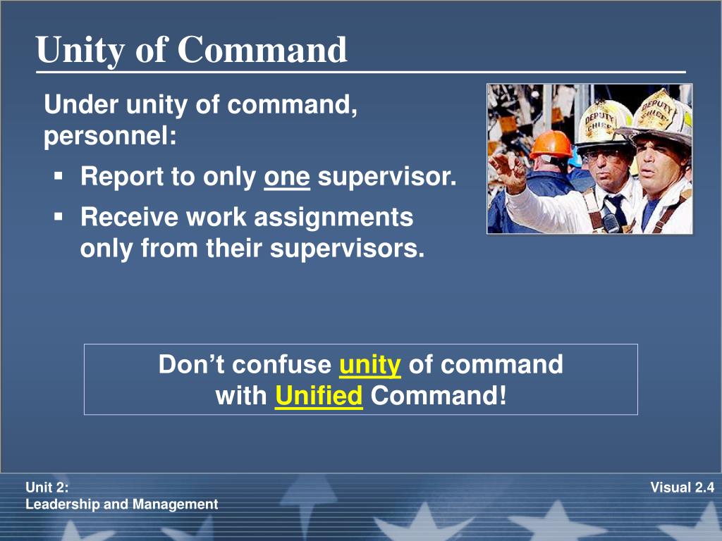 Unity of Command • Under unity of command, personnel: • Report to only one supervisor. • Receive work assignments only from their supervisors. Don’t confuse unityof command with Unified Command!