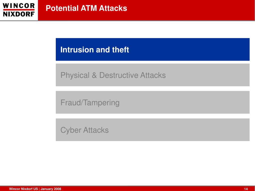 Potential ATM Attacks Intrusion and theft Physical & Destructive Attacks Fraud/Tampering Cyber Attacks