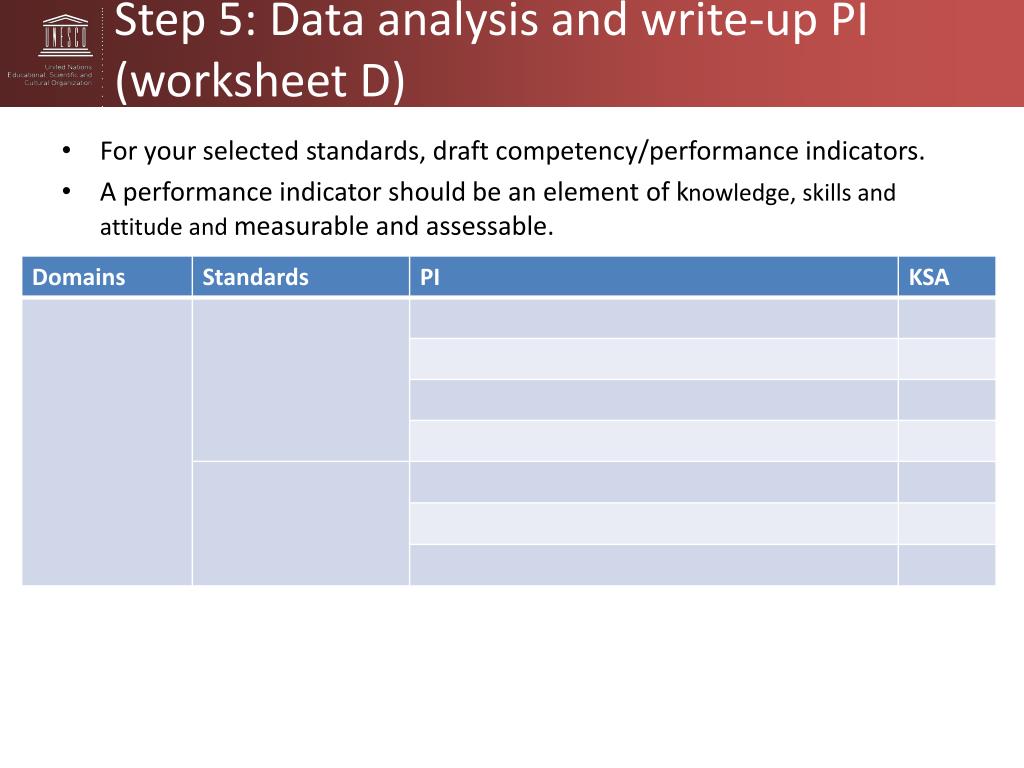 Step 5: Data analysis and write-up PI (worksheet D) • For your selected standards, draft competency/performance indicators. • A performance indicator should be an element of knowledge, skills and attitude and measurable and assessable.