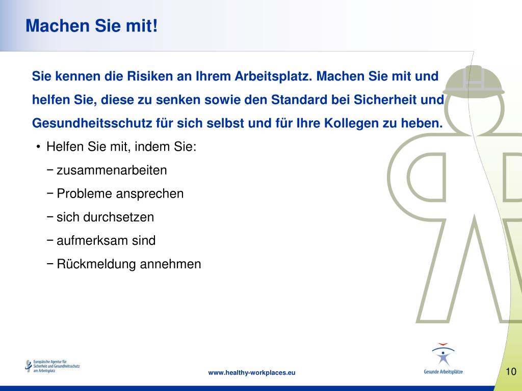 Machen Sie mit! Sie kennen die Risiken an Ihrem Arbeitsplatz. Machen Sie mit und helfen Sie, diese zu senken sowie den Standard bei Sicherheit und Gesundheitsschutz für sich selbst und für Ihre Kollegen zu heben. • Helfen Sie mit, indem Sie: • zusammenarbeiten • Probleme ansprechen • sich durchsetzen • aufmerksam sind • Rückmeldung annehmen