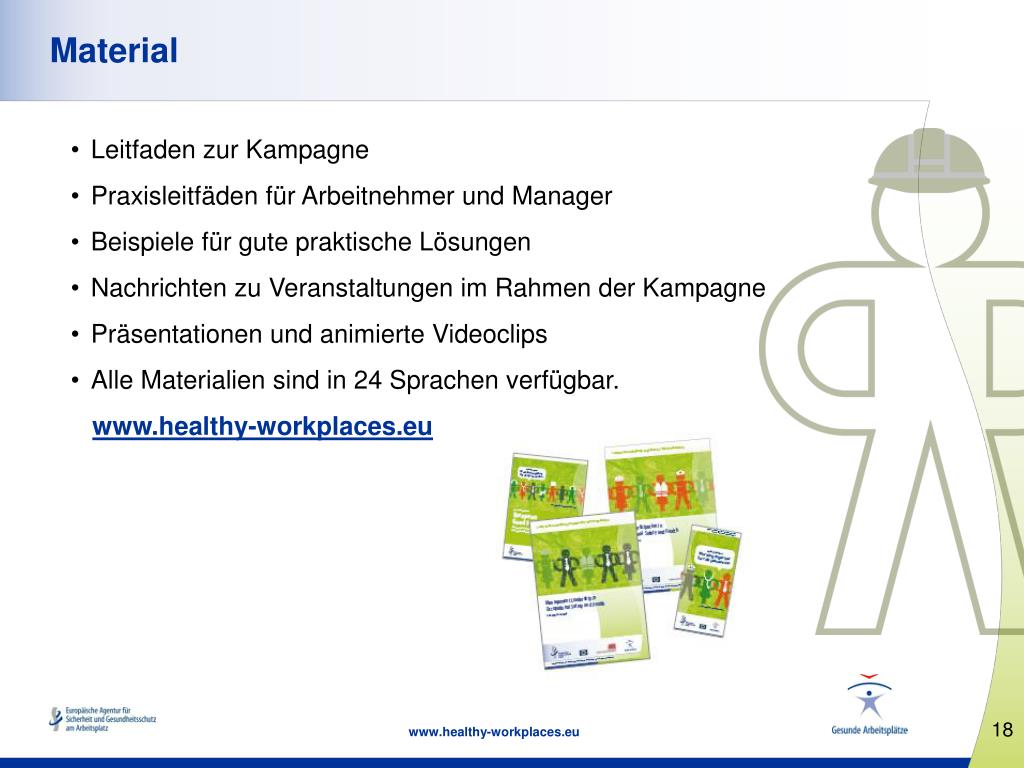 Material • Leitfaden zur Kampagne • Praxisleitfäden für Arbeitnehmer und Manager • Beispiele für gute praktische Lösungen • Nachrichten zu Veranstaltungen im Rahmen der Kampagne • Präsentationen und animierte Videoclips • Alle Materialien sind in 24 Sprachen verfügbar. • www.healthy-workplaces.eu