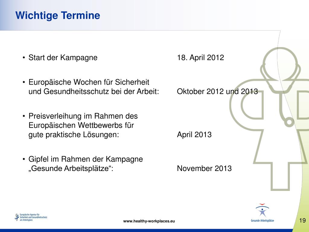 Wichtige Termine 19 • Start der Kampagne 18. April 2012 • Europäische Wochen für Sicherheit und Gesundheitsschutz bei der Arbeit: Oktober 2012 und 2013 • Preisverleihung im Rahmen des Europäischen Wettbewerbs für gute praktische Lösungen: April 2013 • Gipfel im Rahmen der Kampagne „Gesunde Arbeitsplätze“: November 2013
