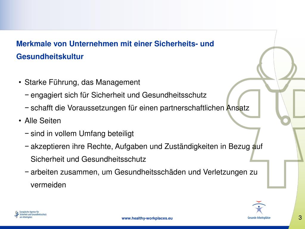Merkmale von Unternehmen mit einer Sicherheits- und Gesundheitskultur • Starke Führung, das Management • engagiert sich für Sicherheit und Gesundheitsschutz • schafft die Voraussetzungen für einen partnerschaftlichen Ansatz • Alle Seiten • sind in vollem Umfang beteiligt • akzeptieren ihre Rechte, Aufgaben und Zuständigkeiten in Bezug auf Sicherheit und Gesundheitsschutz • arbeiten zusammen, um Gesundheitsschäden und Verletzungen zu vermeiden