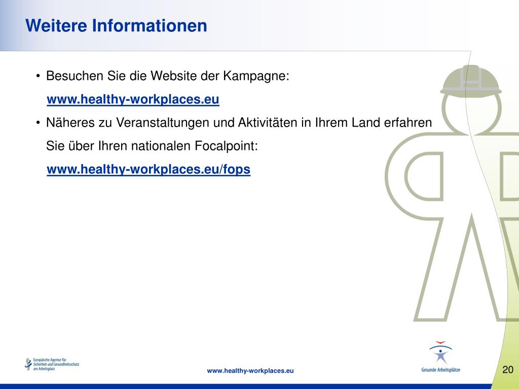 Weitere Informationen • Besuchen Sie die Website der Kampagne: • www.healthy-workplaces.eu • Näheres zu Veranstaltungen und Aktivitäten in Ihrem Land erfahren Sie über Ihren nationalen Focalpoint: • www.healthy-workplaces.eu/fops