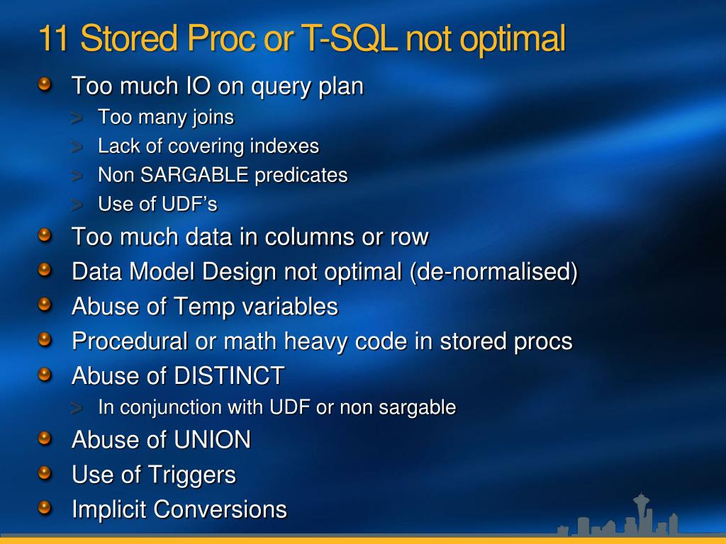 11 Stored Proc or T-SQL not optimal • Too much IO on query plan • Too many joins • Lack of covering indexes • Non SARGABLE predicates • Use of UDF’s • Too much data in columns or row • Data Model Design not optimal (de-normalised) • Abuse of Temp variables • Procedural or math heavy code in stored procs • Abuse of DISTINCT • In conjunction with UDF or non sargable • Abuse of UNION • Use of Triggers • Implicit Conversions