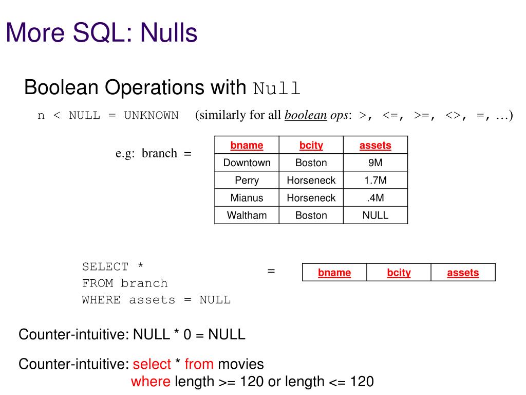 More SQL: Nulls • Boolean Operations with Null n < NULL = UNKNOWN (similarly for all boolean ops: >, <=, >=, <>, =, …) e.g: branch = = SELECT * FROM branch WHERE assets IS NULL