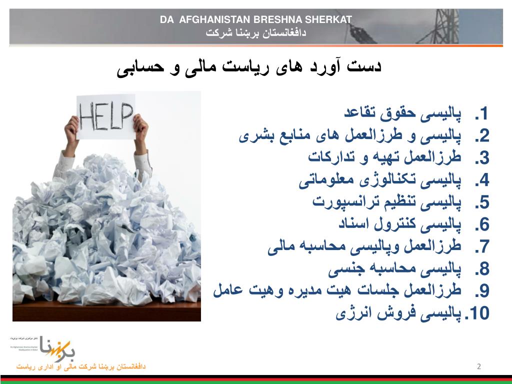 DA AFGHANISTAN BRESHNA SHERKAT دافغانستان برښنا شرکت. د افغانستان برشنا شرکت ریاست مالی و اداری 14 حمل 1392. DA AFGHANISTAN BRESHNA SHERKAT دافغانستان برښنا شرکت. دست آورد های ریاست مالی و حسابی. پالیسی حقوق تقاعد پالیسی و طرزالعمل های منابع بشری طرزالعمل تهیه و تدارکات