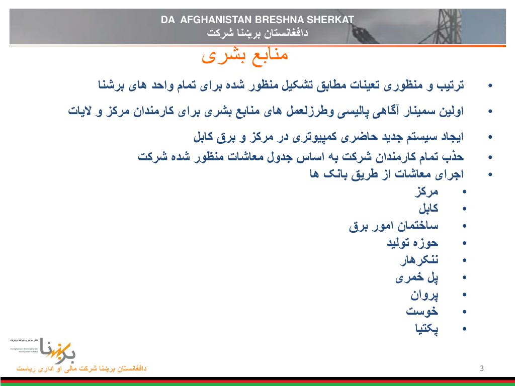 DA AFGHANISTAN BRESHNA SHERKAT دافغانستان برښنا شرکت منابع بشری • ترتیب و منظوری تعینات مطابق تشکیل منظور شده برای تمام واحد های برشنا • اولین سمینار آگاهی پالیسی وطرزلعمل های منابع بشری برای کارمندان مرکز و لایات • ایجاد سیستم جدید حاضری کمپیوتری در مرکز و برق کابل • حذب تمام کارمندان شرکت به اساس جدول معاشات منظور شده شرکت • اجرای معاشات از طریق بانک ها • مرکز • کابل • ساختمان امور برق • حوزه تولید • ننکرهار • پل خمری • پروان • خوست • پکتیا دافغانستان برښنا شرکتمالی او اداری ریاست