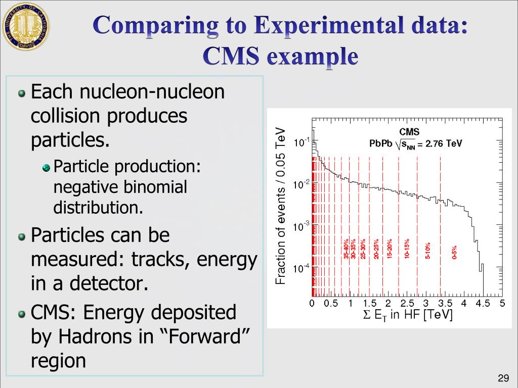 Comparing to Experimental data:CMS example • Each nucleon-nucleon collision produces particles. • Particle production: negative binomial distribution. • Particles can be measured: tracks, energy in a detector. • CMS: Energy deposited by Hadrons in “Forward” region