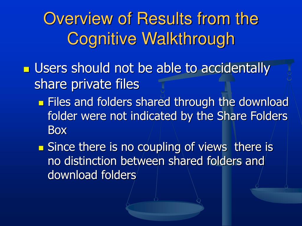 Overview of Results from the Cognitive Walkthrough • Users should not be able to accidentally share private files • Files and folders shared through the download folder were not indicated by the Share Folders Box • Since there is no coupling of views there is no distinction between shared folders and download folders