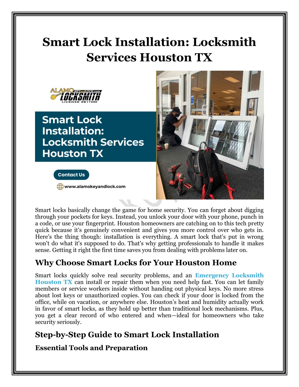 Get your tools ready before you start: ● Screwdrivers (both Phillips and flathead) ● Drill with the right bits ● Measuring tape ● Deadbolt removal tool ● Level ● Flashlight Check your door thickness first. Most smart locks work fine on standard doors, but not all of them do. Read through the manufacturer's instructions carefully. Switch off power to anything connected before messing with wires. Take off the inside part of your old deadbolt. Hold onto all the original hardware just in case you need it later. The Installation Process Get the old lockout completely. Clean out any debris from the hole. Slide the new smart lock's outside piece into the opening. Make sure it sits straight, and use your level to check. Tighten it down from the inside using the bolts it comes with. Don't overtighten or you'll strip the threads. Assemble the inside part next. Connect the wires for power or smart features. Test the lock several times before finishing up. Make sure it locks and unlocks smoothly without grinding. Common Challenges and Pro Tips Door frames aren't always perfectly straight. You can use shims to get a crooked lock lined up. Older doors might need you to make the hole bigger. Drill slowly so ydue to,ou don't crack the wood. Batteries in battery-powered locks should be fresh before you install. Dead batteries mean you're stuck outside. Keep a regular key somewhere safe as backup. Smart systems can mess up sometimes, whether it's from weather, power issues, or software problems. Auto Lockout Service Houston TX: When Smart Tech Fails Technology's great until it isn't. Dead batteries, a forgotten code, or system glitches can lock you out of your own place. Auto Lockout Service Houston TX helps you get back inside without the panic. Professional locksmiths have the tools and know-how to get past smart locks safely without cquickly,ausing damage. They show up fast, get the job done, and have you back in your home quick. Why Trust Alamo Key and Lock in Houston TX When you need Locksmith Services Houston TX, Alamo Key and Lock knows their stuff. The technicians really understand how smart lock systems work. They install them