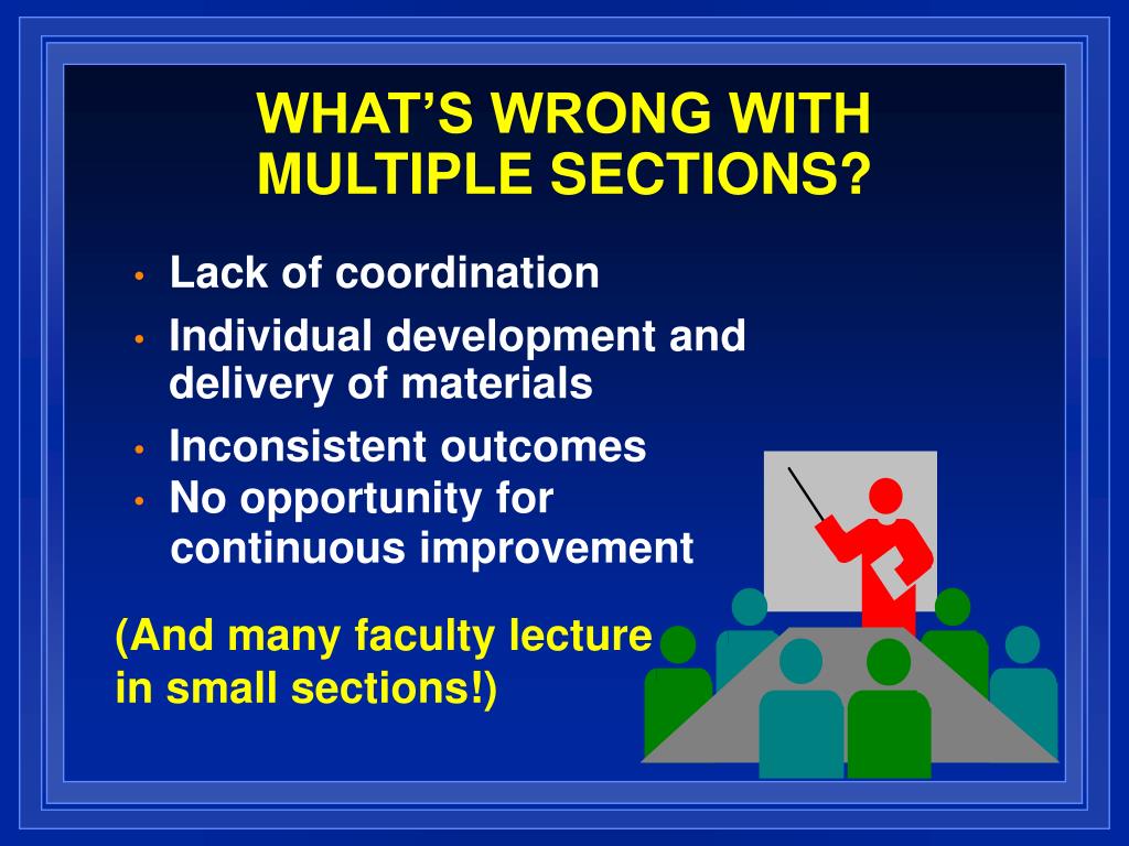 WHAT’S WRONG WITH MULTIPLE SECTIONS? • Lack of coordination • Individual development and delivery of materials • Inconsistent outcomes • No opportunity for continuous improvement (And many faculty lecture in small sections!)