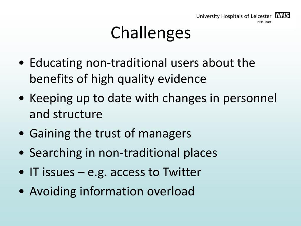 Challenges • Educating non-traditional users about the benefits of high quality evidence • Keeping up to date with changes in personnel and structure • Gaining the trust of managers • Searching in non-traditional places • IT issues – e.g. access to Twitter • Avoiding information overload