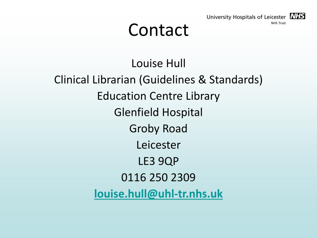 Contact Louise Hull Clinical Librarian (Guidelines & Standards) Education Centre Library Glenfield Hospital Groby Road Leicester LE3 9QP 0116 250 2309 louise.hull@uhl-tr.nhs.uk
