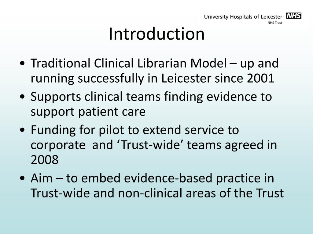 Introduction • Traditional Clinical Librarian Model – up and running successfully in Leicester since 2001 • Supports clinical teams finding evidence to support patient care • Funding for pilot to extend service to corporate and ‘Trust-wide’ teams agreed in 2008 • Aim – to embed evidence-based practice in Trust-wide and non-clinical areas of the Trust