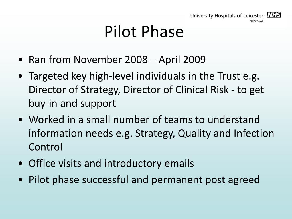 Pilot Phase • Ran from November 2008 – April 2009 • Targeted key high-level individuals in the Trust e.g. Director of Strategy, Director of Clinical Risk - to get buy-in and support • Worked in a small number of teams to understand information needs e.g. Strategy, Quality and Infection Control • Office visits and introductory emails • Pilot phase successful and permanent post agreed