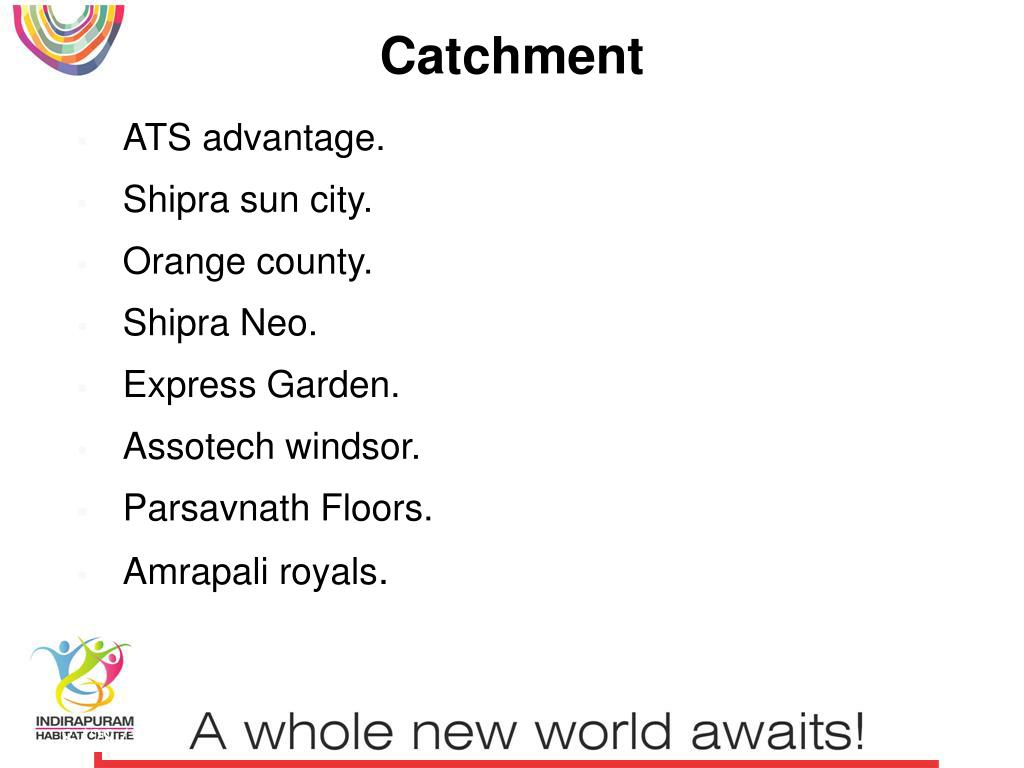 Catchment • ATS advantage. • Shipra sun city. • Orange county. • Shipra Neo. • Express Garden. • Assotech windsor. • Parsavnath Floors. • Amrapali royals.