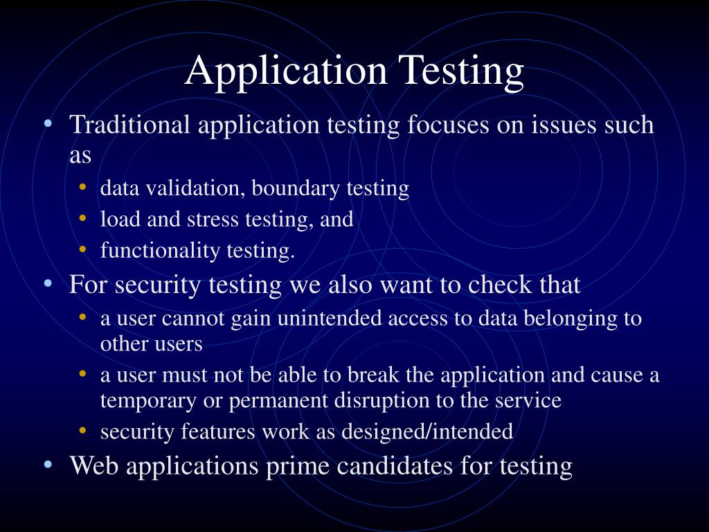 Application Testing • Traditional application testing focuses on issues such as • data validation, boundary testing • load and stress testing, and • functionality testing. • For security testing we also want to check that • a user cannot gain unintended access to data belonging to other users • a user must not be able to break the application and cause a temporary or permanent disruption to the service • security features work as designed/intended • Web applications prime candidates for testing