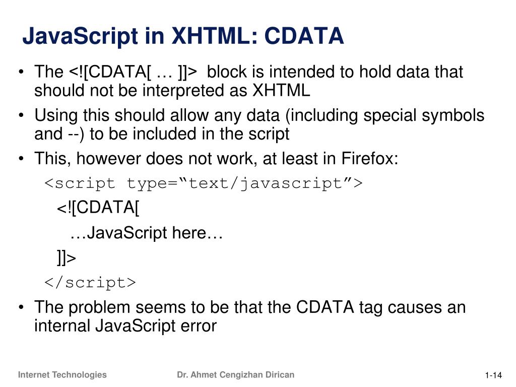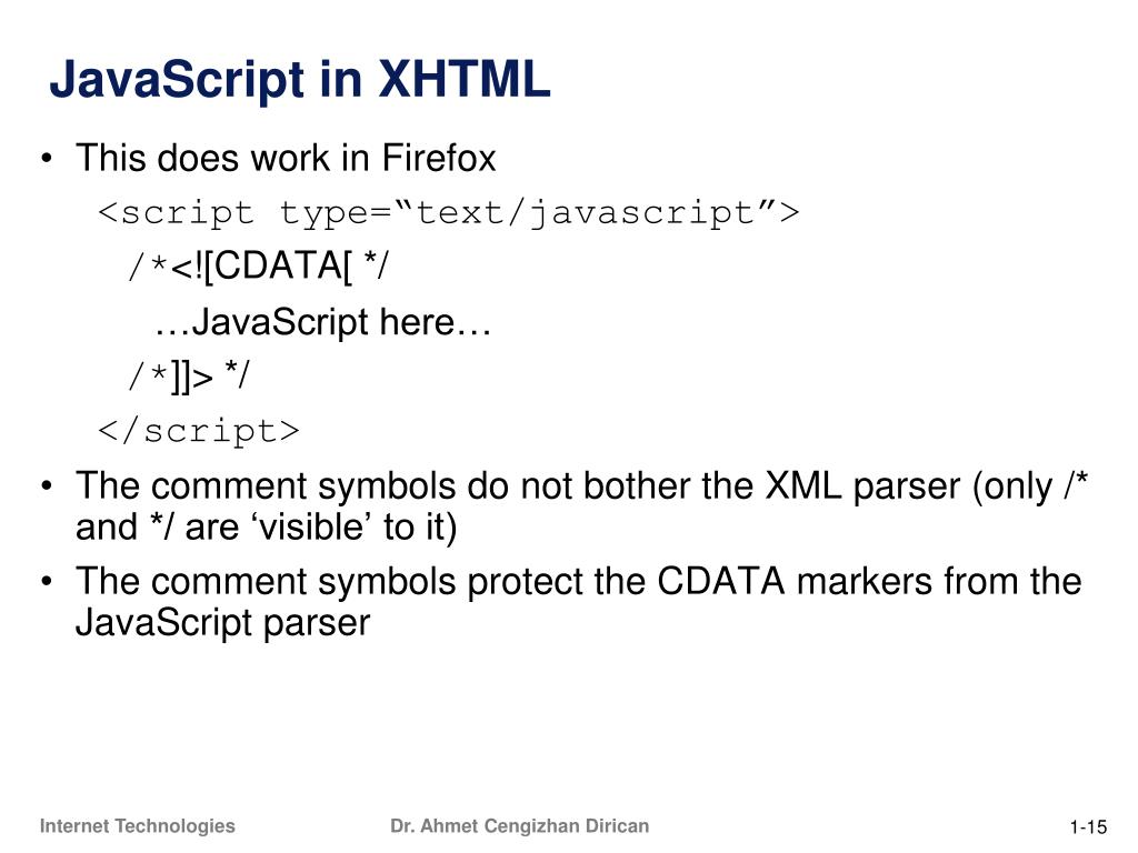 JavaScript in XHTML • This does work in Firefox <script type=“text/javascript”> /*<![CDATA[ */ …JavaScript here… /*]]> */ </script> • The comment symbols do not bother the XML parser (only /* and */ are ‘visible’ to it) • The comment symbols protect the CDATA markers from the JavaScript parser