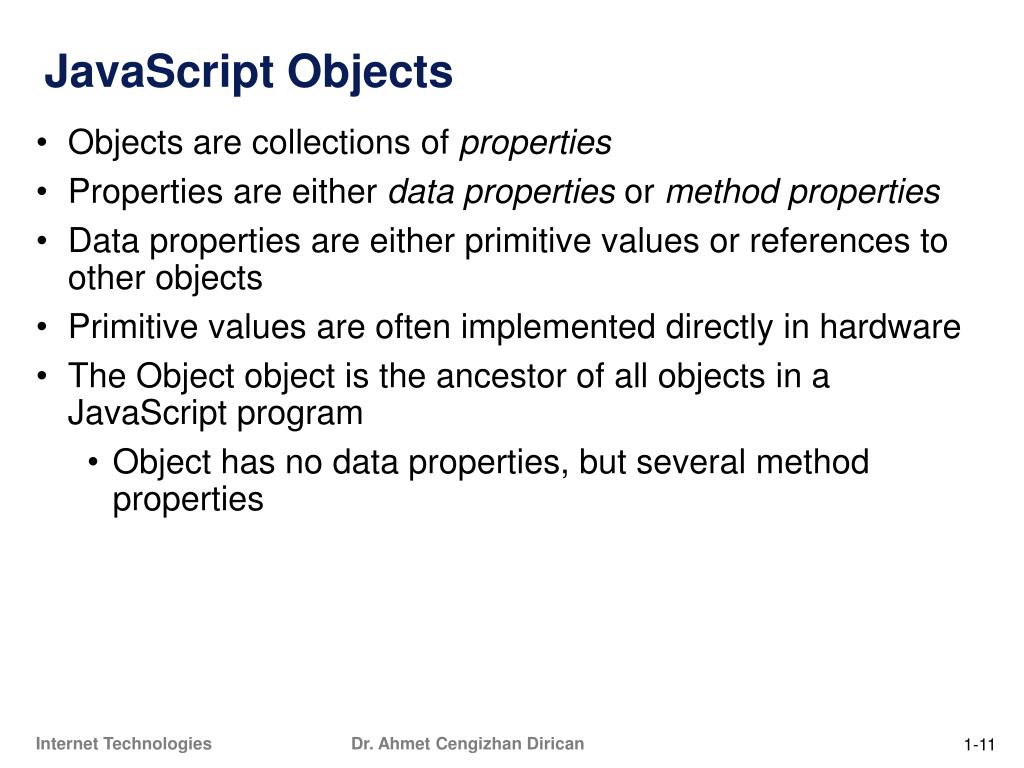 JavaScript Objects • Objects are collections of properties • Properties are either data properties or method properties • Data properties are either primitive values or references to other objects • Primitive values are often implemented directly in hardware • The Object object is the ancestor of all objects in a JavaScript program • Object has no data properties, but several method properties