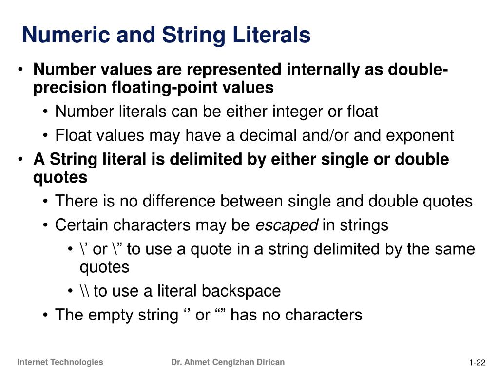 Numeric and String Literals • Number values are represented internally as double-precision floating-point values • Number literals can be either integer or float • Float values may have a decimal and/or and exponent • A String literal is delimited by either single or double quotes • There is no difference between single and double quotes • Certain characters may be escaped in strings • \’ or \” to use a quote in a string delimited by the same quotes • \\ to use a literal backspace • The empty string ‘’ or “” has no characters