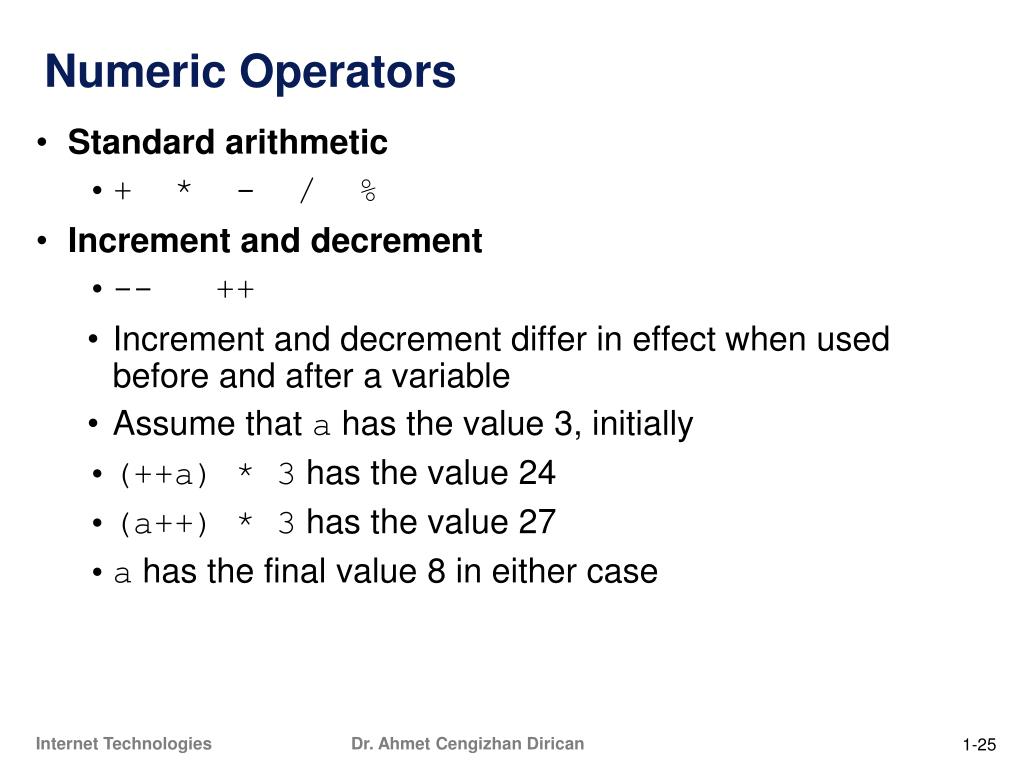 Numeric Operators • Standard arithmetic • + * - / % • Increment and decrement • -- ++ • Increment and decrement differ in effect when used before and after a variable • Assume that a has the value 3, initially • (++a) * 3 has the value 24 • (a++) * 3 has the value 27 • a has the final value 8 in either case