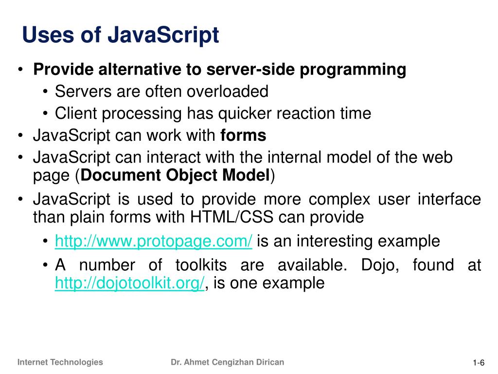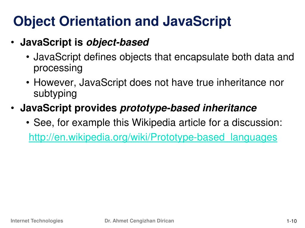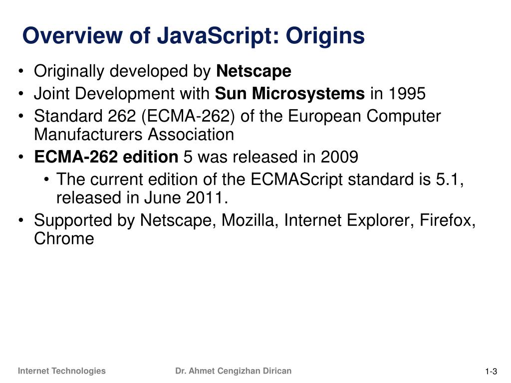 BIL 374 Internet Technologies. Dr. Ahmet Cengizhan Dirican. 4. Basics of JavaScript. Origins. Overview of JavaScript: Origins. Originally developed by Netscape Joint Development with Sun Microsystems in 1995 Standard 262 (ECMA-262) of the European Computer Manufacturers Association
