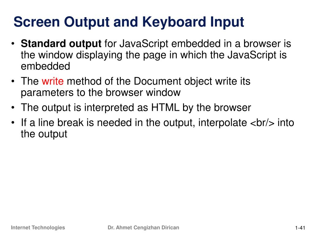 Screen Output and Keyboard Input • Standard output for JavaScript embedded in a browser is the window displaying the page in which the JavaScript is embedded • The write method of the Document object write its parameters to the browser window • The output is interpreted as HTML by the browser • If a line break is needed in the output, interpolate <br/> into the output