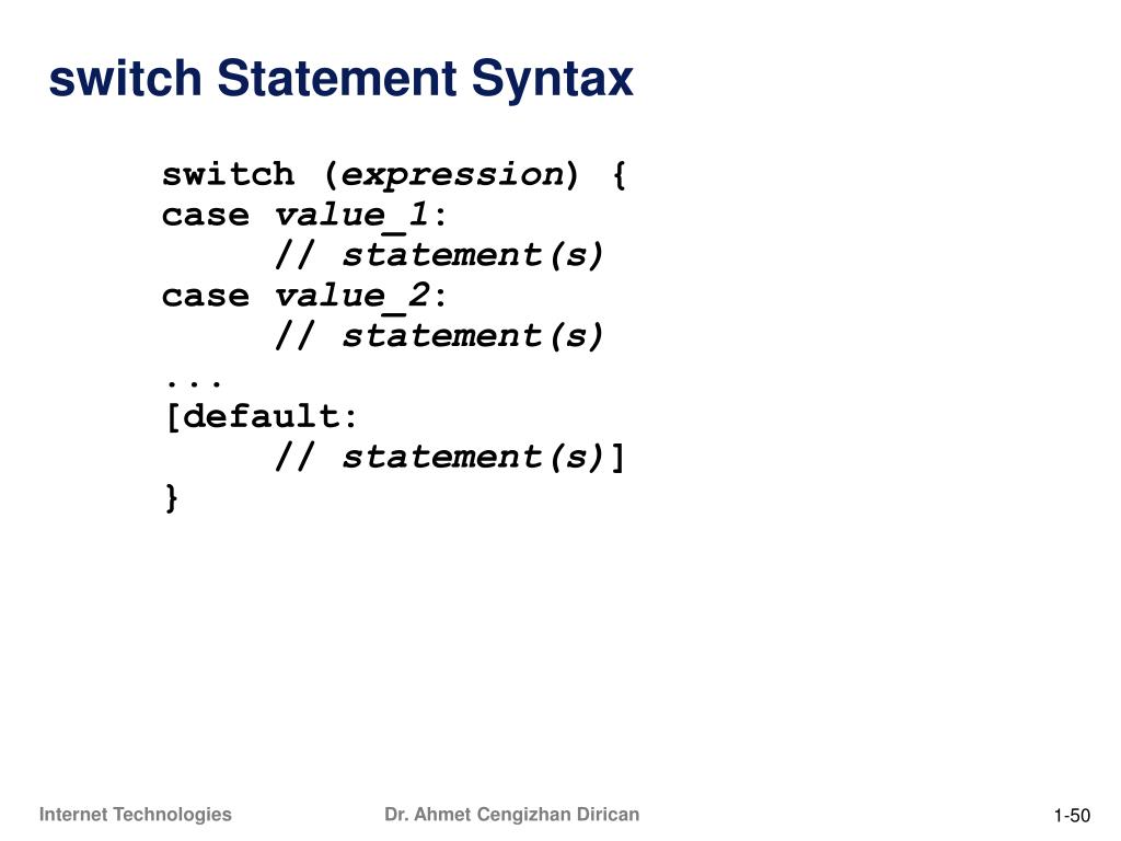 switch Statement Syntax switch (expression) { case value_1: // statement(s) case value_2: // statement(s) ... [default: // statement(s)] }