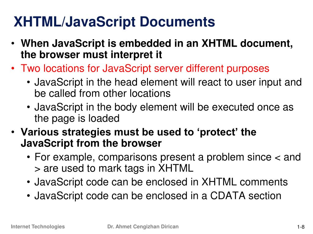 XHTML/JavaScript Documents • When JavaScript is embedded in an XHTML document, the browser must interpret it • Two locations for JavaScript server different purposes • JavaScript in the head element will react to user input and be called from other locations • JavaScript in the body element will be executed once as the page is loaded • Various strategies must be used to ‘protect’ the JavaScript from the browser • For example, comparisons present a problem since < and > are used to mark tags in XHTML • JavaScript code can be enclosed in XHTML comments • JavaScript code can be enclosed in a CDATA section
