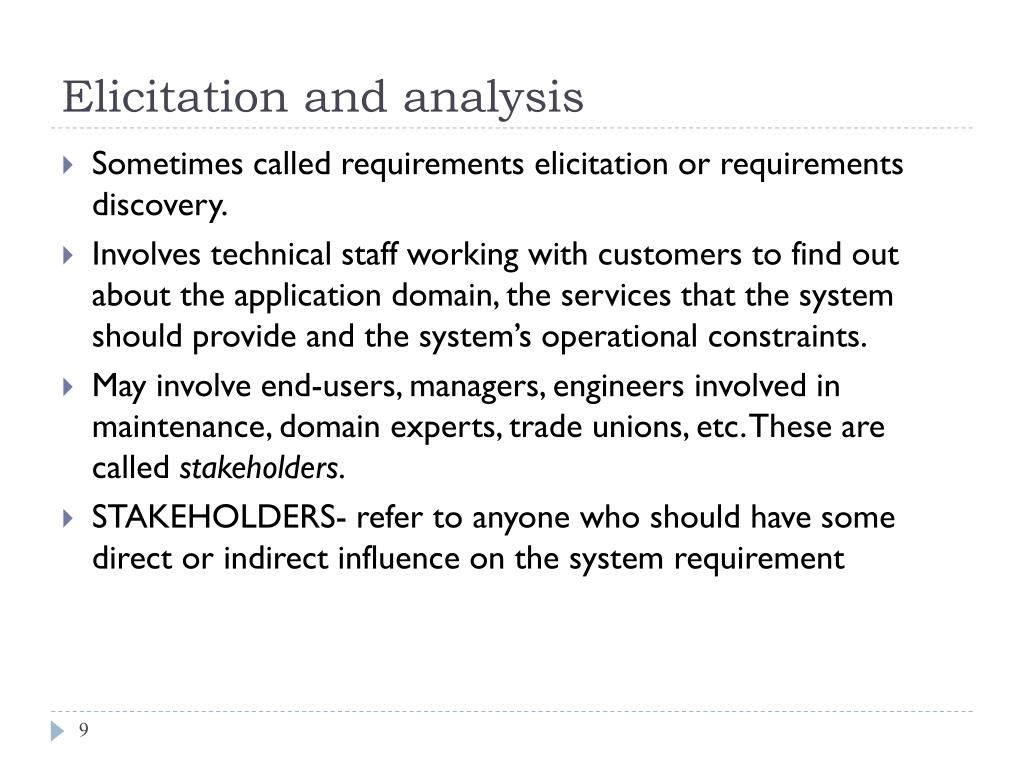Elicitation and analysis • Sometimes called requirements elicitation or requirements discovery. • Involves technical staff working with customers to find out about the application domain, the services that the system should provide and the system’s operational constraints. • May involve end-users, managers, engineers involved in maintenance, domain experts, trade unions, etc. These are called stakeholders. • STAKEHOLDERS- refer to anyone who should have some direct or indirect influence on the system requirement