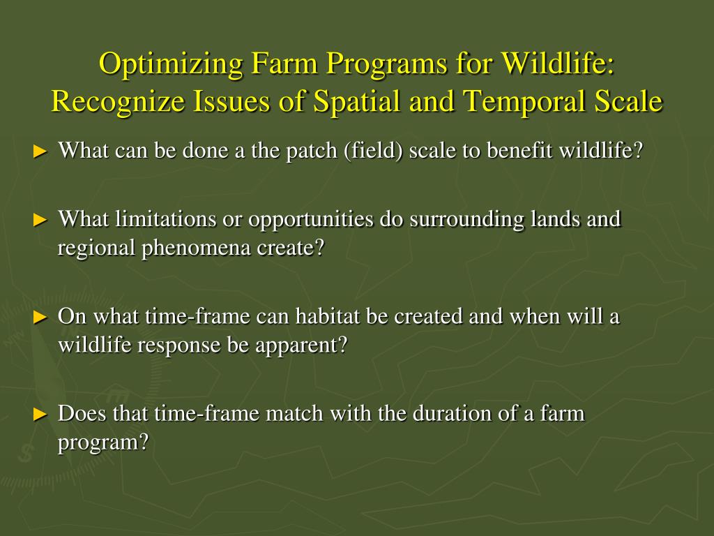 Optimizing Farm Programs for Wildlife:Recognize Issues of Spatial and Temporal Scale • What can be done a the patch (field) scale to benefit wildlife? • What limitations or opportunities do surrounding lands and regional phenomena create? • On what time-frame can habitat be created and when will a wildlife response be apparent? • Does that time-frame match with the duration of a farm program?