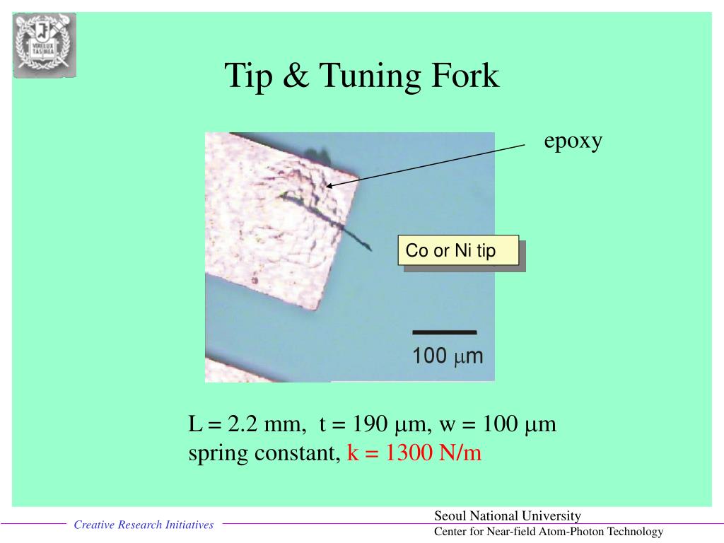 Tip & Tuning Fork epoxy Co or Ni tip L = 2.2 mm, t = 190 mm, w = 100 mm spring constant, k = 1300 N/m