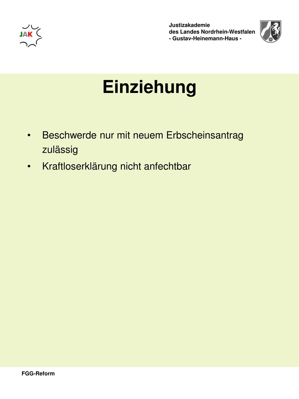 FamFG: Inkrafttreten am 01.09.2009 Aber:Art. 111 FGG-RFG bestimmt, dass auf Verfahren, die bis zum Inkrafttreten des FamFG eingeleitet worden sind oder deren Einleitung bis zum Inkrafttreten des FamFG beantragt wurden, die vor Inkrafttreten des FamFG geltenden Vorschriften anzuwenden sind. Daraus folgt, dass auf laufende Verfahren das alte Recht noch Anwendung findet. Also:Im Nachlassverfahren (einschließlich des Rechtsmittelzuges) gelten über einen längeren Zeitraum zwei Verfahrensordnungen.Im Registerrecht dürfte sich die alte Verfahrensordnung bald erledigt haben.