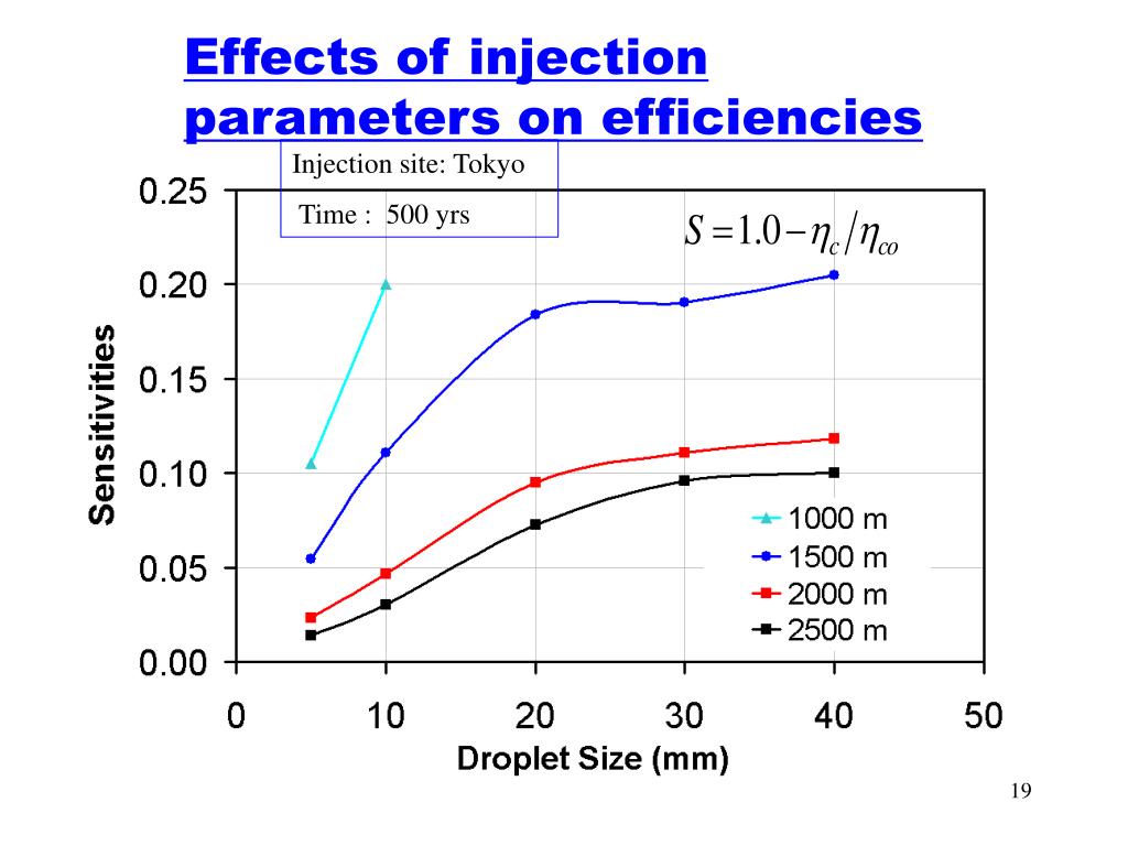 Conclusions & discussions Within 500 years after releasing CO2 at rate of 0.1 Ggt C /year by moving-ship: • Efficiency is related with not only depths and sits but also drop size injected. • For droplets size D0 = 5 – 40 mm, the storage efficiencies could be reduced by range of 5% to 20% if release depth less than 2600m due to the rising plumes. • Implement of DIC vertical pdf into OGCM for further checking. (Nesting grids system ?) • The roles of injection parameters on biological impacts in near-field should is another challenge.