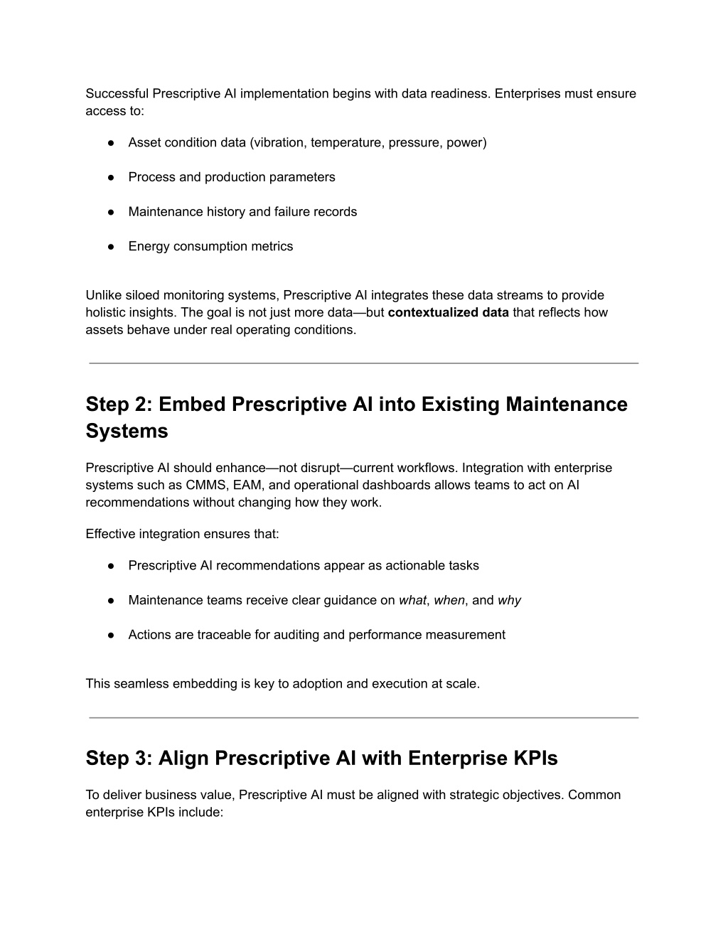 Successful Prescriptive AI implementation begins with data readiness. Enterprises must ensure access to: ● Asset condition data (vibration, temperature, pressure, power) ● Process and production parameters ● Maintenance history and failure records ● Energy consumption metrics Unlike siloed monitoring systems, Prescriptive AI integrates these data streams to provide holistic insights. The goal is not just more data—but contextualized data that reflects how assets behave under real operating conditions. Step 2: Embed Prescriptive AI into Existing Maintenance Systems Prescriptive AI should enhance—not disrupt—current workflows. Integration with enterprise systems such as CMMS, EAM, and operational dashboards allows teams to act on AI recommendations without changing how they work. Effective integration ensures that: ● Prescriptive AI recommendations appear as actionable tasks ● Maintenance teams receive clear guidance on what, when, and why ● Actions are traceable for auditing and performance measurement This seamless embedding is key to adoption and execution at scale. Step 3: Align Prescriptive AI with Enterprise KPIs To deliver business value, Prescriptive AI must be aligned with strategic objectives. Common enterprise KPIs include: