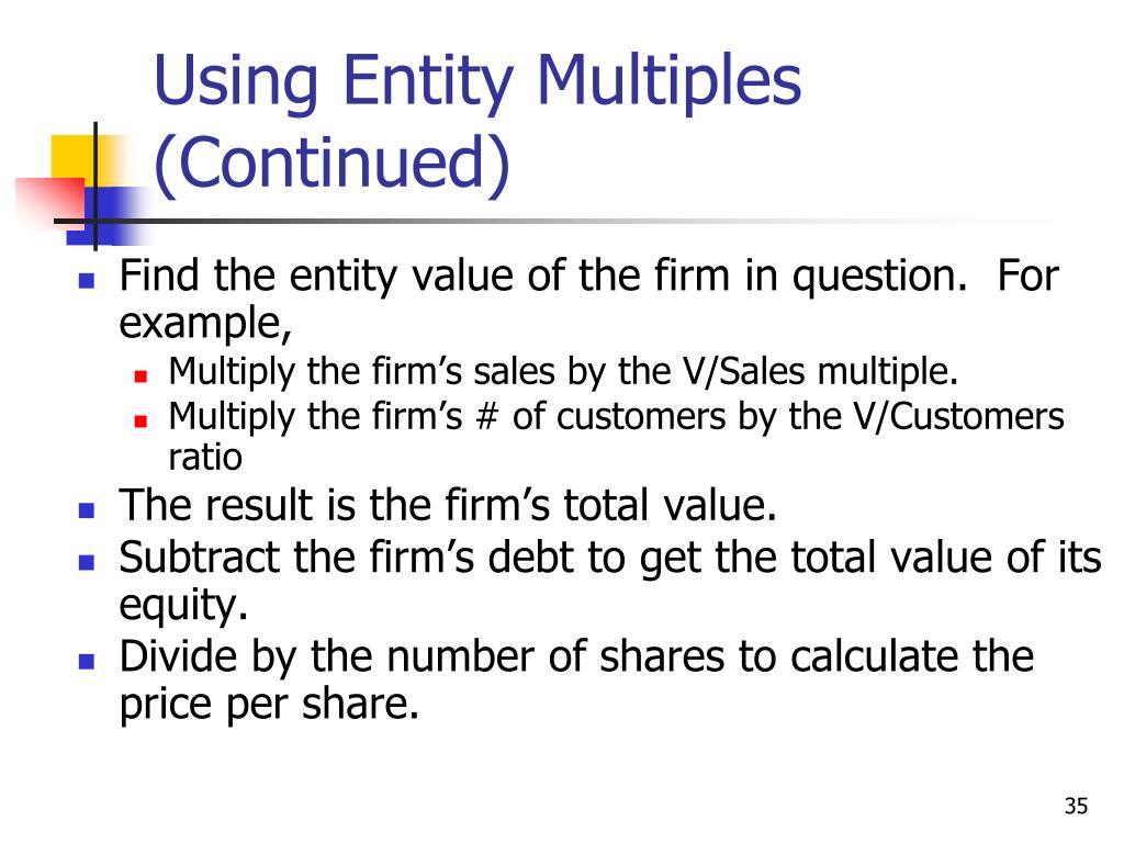 Using Entity Multiples (Continued) Find the entity value of the firm in question. For example, Multiply the firm’s sales by the V/Sales multiple. Multiply the firm’s # of customers by the V/Customers ratio The result is the firm’s total value. Subtract the firm’s debt to get the total value of its equity. Divide by the number of shares to calculate the price per share.