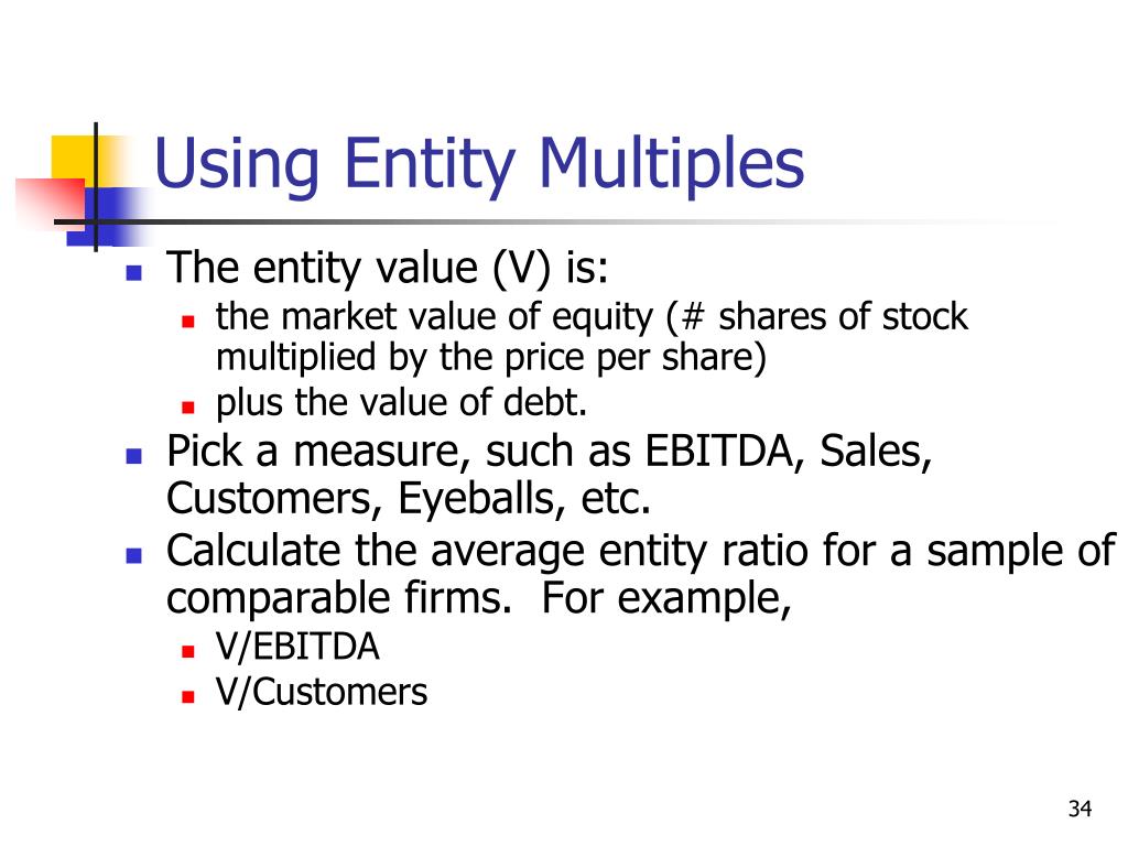 Using Entity Multiples The entity value (V) is: the market value of equity (# shares of stock multiplied by the price per share) plus the value of debt. Pick a measure, such as EBITDA, Sales, Customers, Eyeballs, etc. Calculate the average entity ratio for a sample of comparable firms. For example, V/EBITDA V/Customers