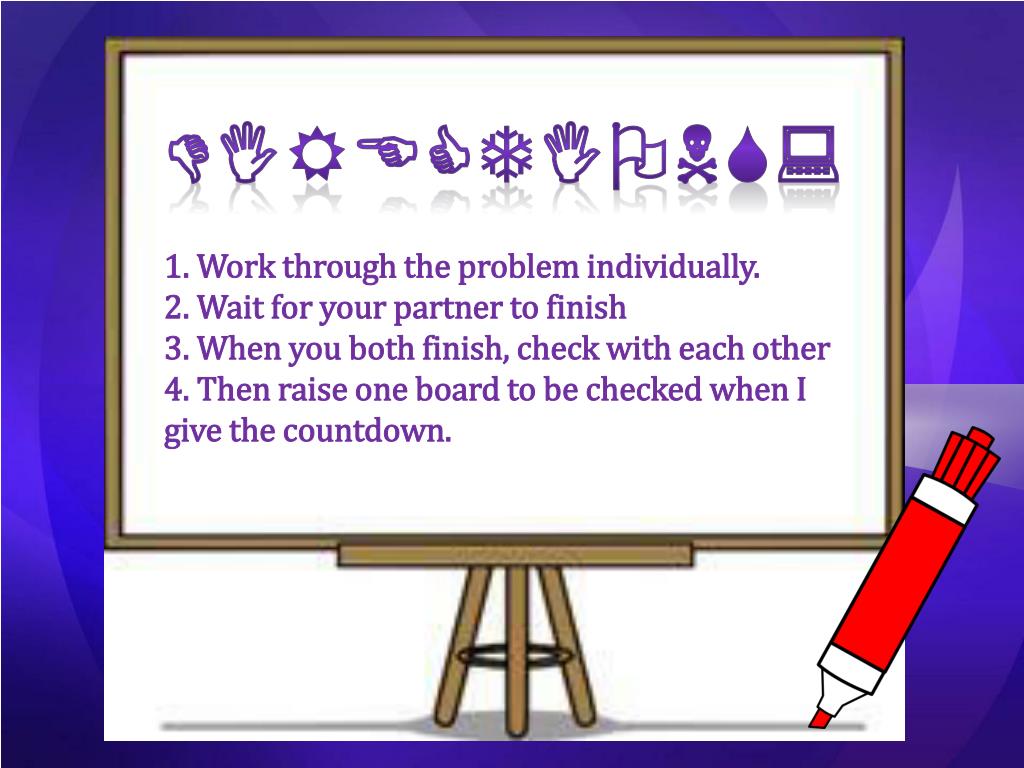 Directions: 1. Work through the problem individually. 2. Wait for your partner to finish 3. When you both finish, check with each other 4. Then raise one board to be checked when I give the countdown.