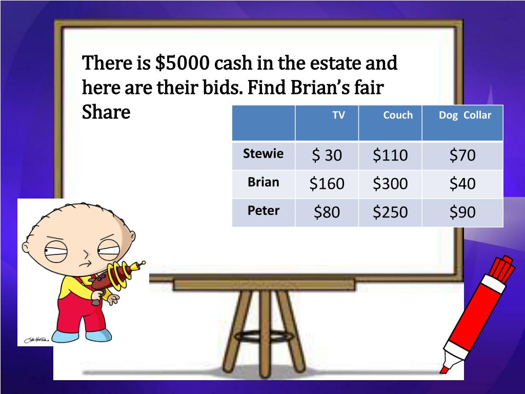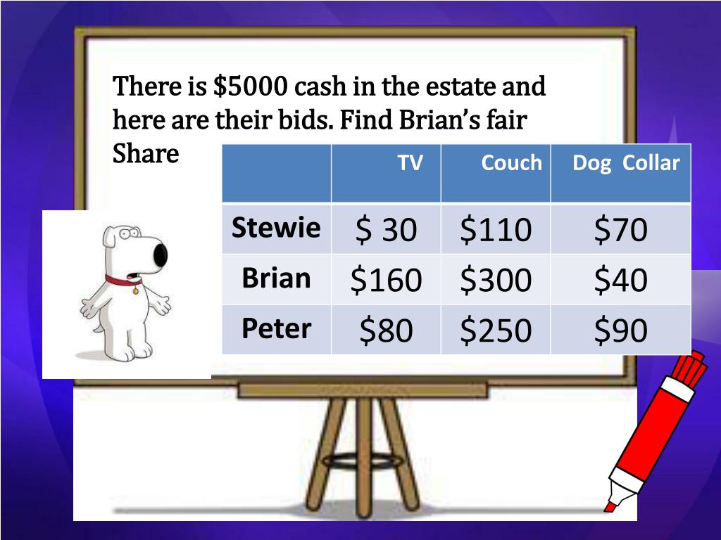 There is $5000 cash in the estate and here are their bids. Find Brian’s fair Share