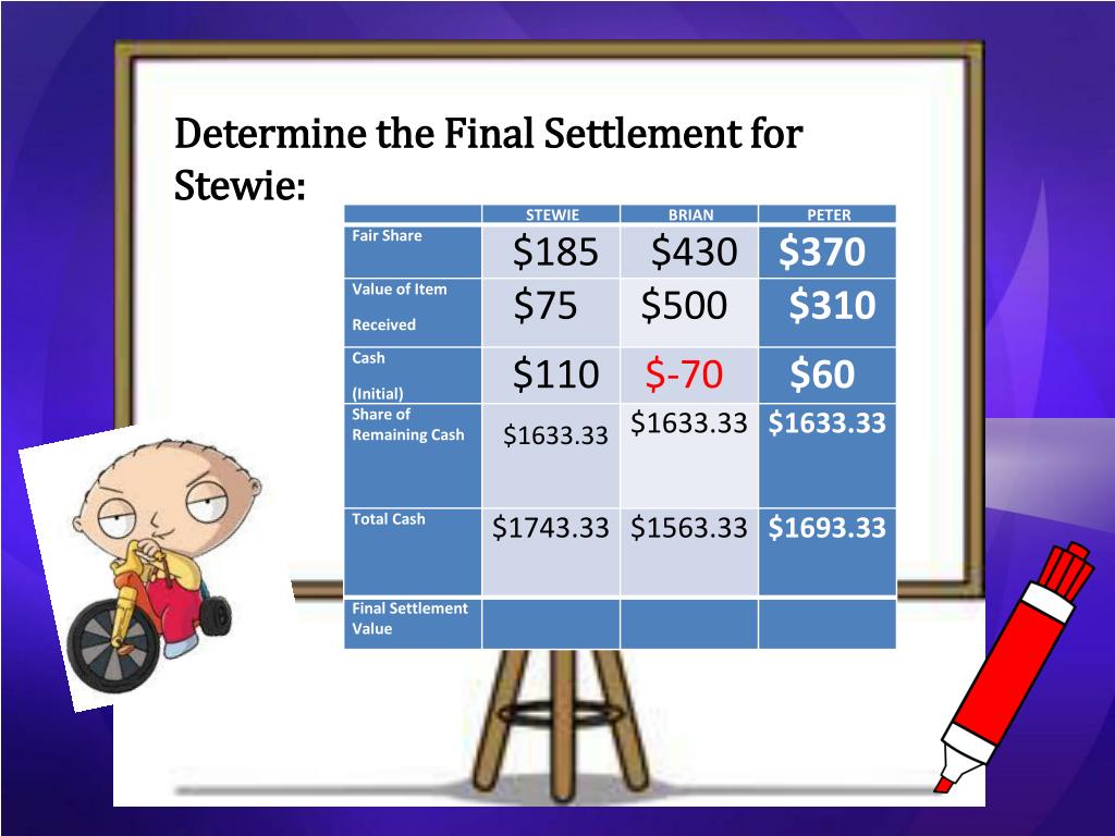 In this exercise, you will work through an estate division scenario involving cash distribution among three individuals: Stewie, Brian, and Peter. The total estate includes $30,000, with specific initial cash distributions of $570 to Stewie, $1,250 to Brian, and $925 owed by Peter. Your tasks include calculating the fair share of remaining cash for each individual, determining Brian’s fair share based on bids, and figuring out Peter’s initial cash return if the estate is $5,000. Additionally, you'll determine the Condorcet winner in an old scenario. Work independently and verify your answers with a partner.