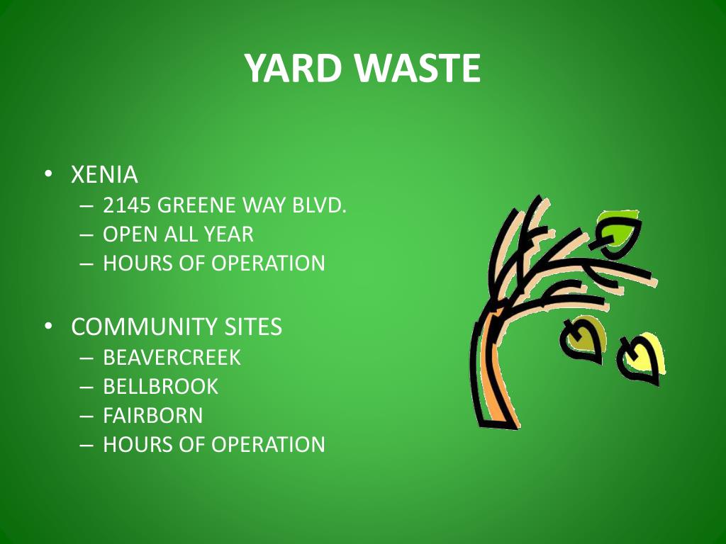 YARD WASTE • XENIA • 2145 GREENE WAY BLVD. • OPEN ALL YEAR • HOURS OF OPERATION • COMMUNITY SITES • BEAVERCREEK • BELLBROOK • FAIRBORN • HOURS OF OPERATION