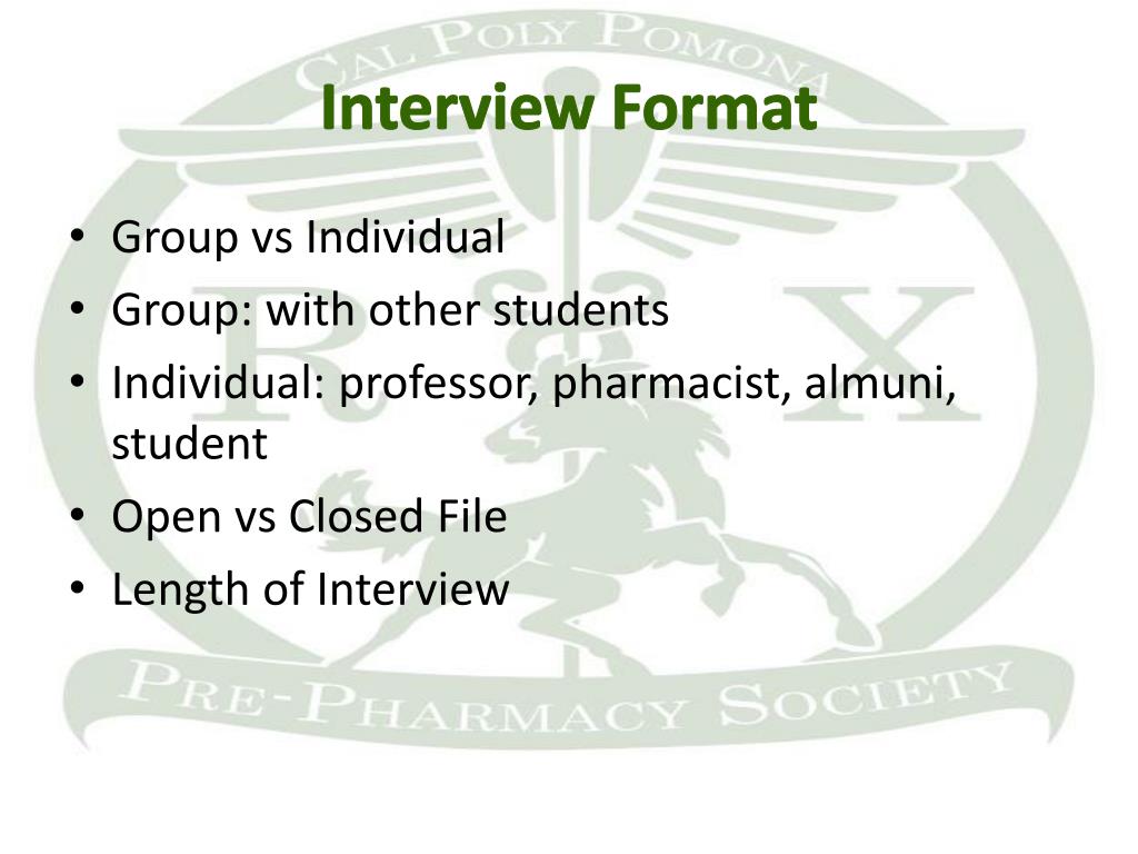Interview Format • Group vs Individual • Group: with other students • Individual: professor, pharmacist, almuni, student • Open vs Closed File • Length of Interview